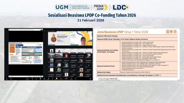 Direktorat Sumber Daya Manusia (DSDM) Universitas Gadjah Mada menyelenggarakan Sosialisasi Beasiswa Co-Funding Tahun 2026 sebagai bagian dari komitmen pengembangan kapasitas sumber daya manusia UGM melalui skema pendanaan kolaboratif bersama Lembaga Pengelola Dana Pendidikan (LPDP). Sosialisasi ini dilaksanakan secara daring pada 21 Februari 2026 dan dihadiri 143 dosen berbagai fakultas dan sekolah di lingkungan UGM yang antusias untuk memperoleh informasi terkait peluang studi lanjut melalui skema pendanaan kolaboratif..